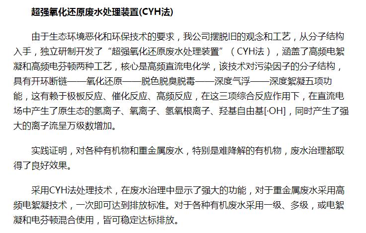 超強(qiáng)氧化還原廢水處理裝置(CYH法)處理各種有機(jī)廢水、各種重金屬?gòu)U水